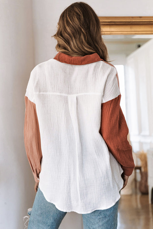 Brown Color Block Pockets Textured Long Sleeve Shacket