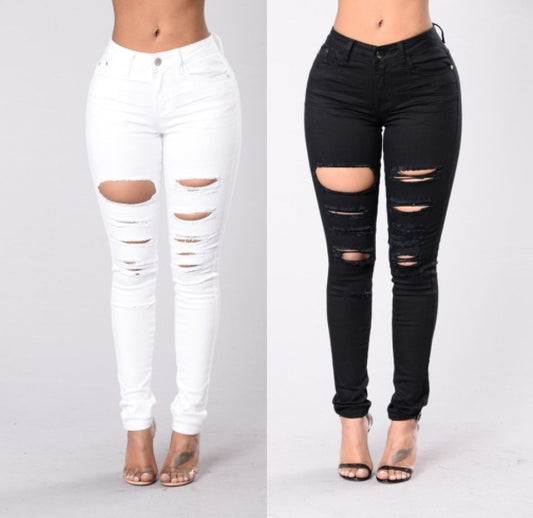 New casual sexy jeans woman cotton denim trousers slim mid waist ripped holes pencil pants cowboy jeans femme