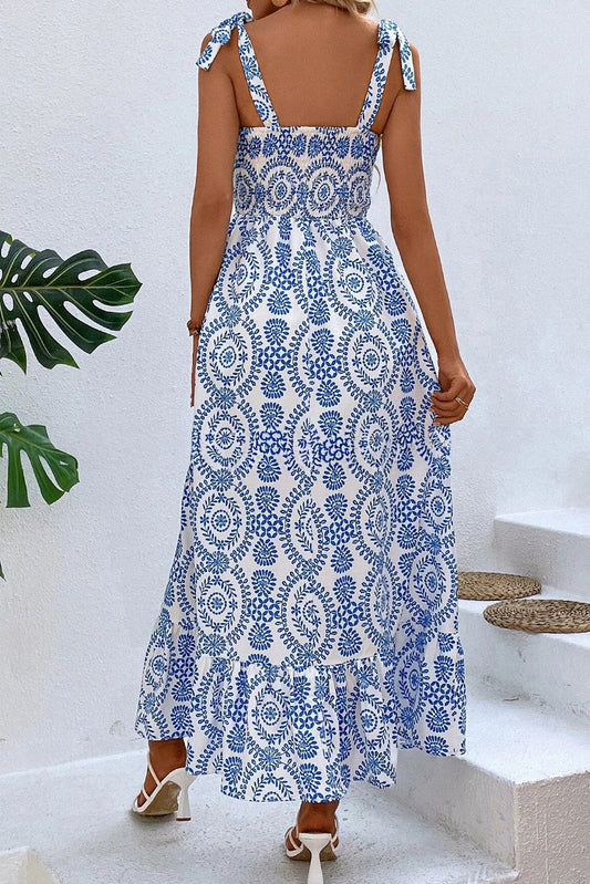 Blue Ethnic Print Side Split Sleeveless Maxi Dress