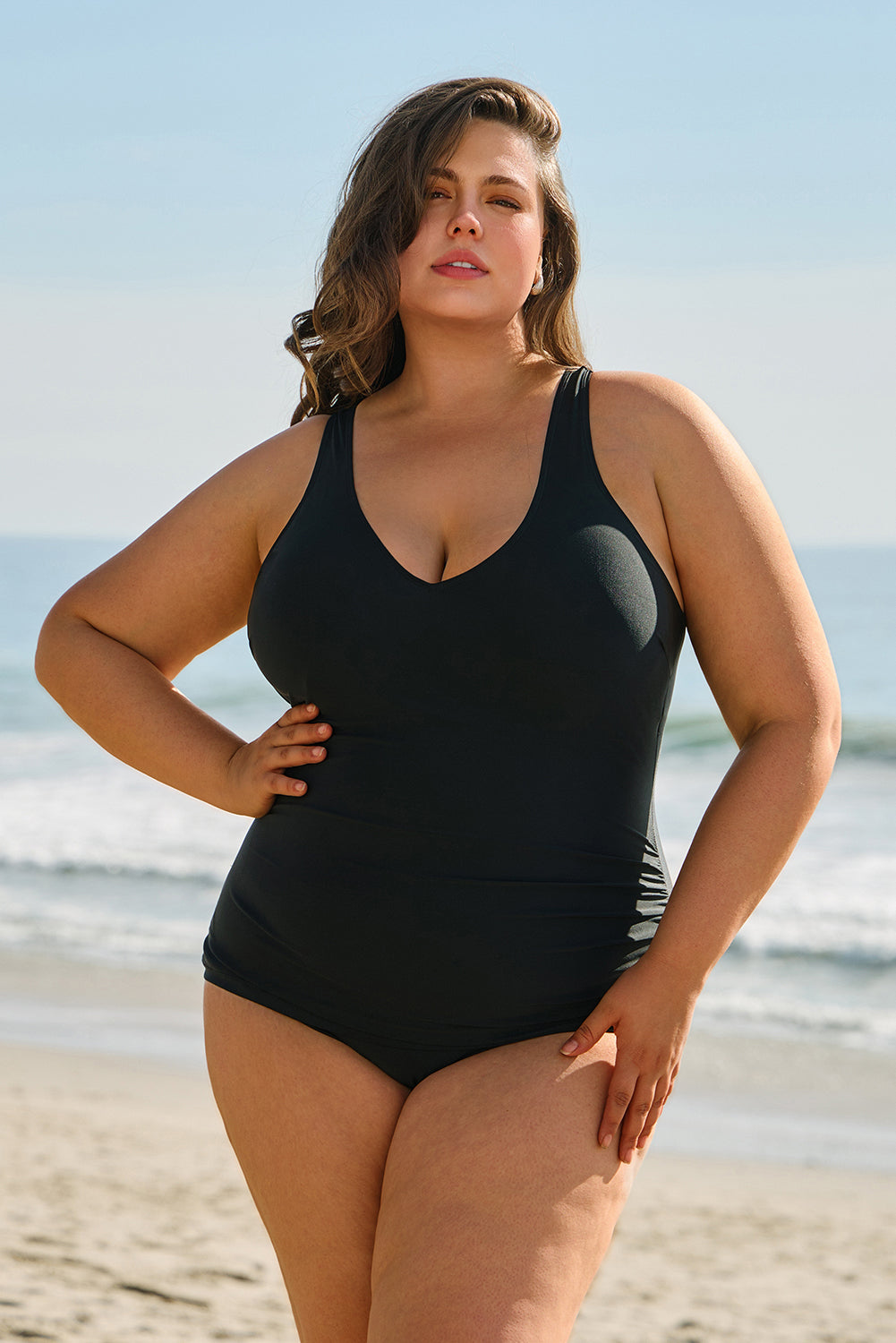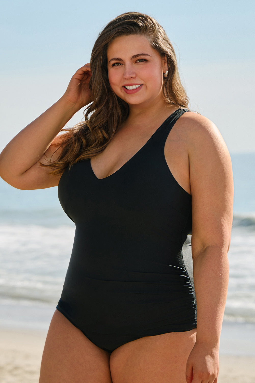 Black Solid Color U Neck Padded Plus Size One Piece Swimsuit